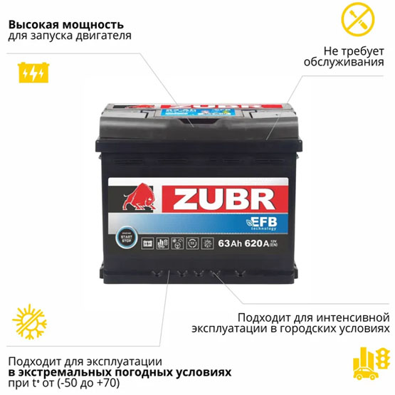 Аккумулятор Zubr EFB 63 A/h 620 A R+ 242x175x190 мм