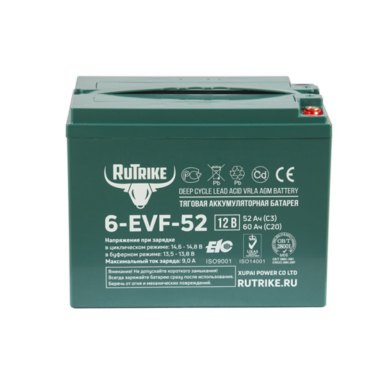 Аккумулятор RuTrike 6-EVF-52 идеально подходит для техники, требующей надежного и долговечного источника питания с возможностью глубокого разряда: